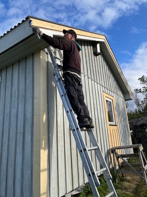 Mästermålaren Robin tar första penseldragen med nya fasadfärgen och Fred oljar in de nya vindskivorna