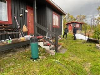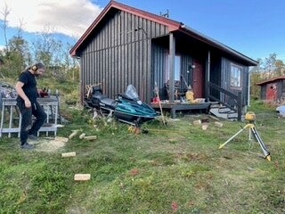 Fred, Tim och Torulf åkte upp till Abisko den 11/9 på eftermiddag med fullastad bil och släpvagn (släpet vägde säkert över ett ton) med lyftutrustning och betongplintar och verktyg m.m. för att räta upp plintarna på stugan.