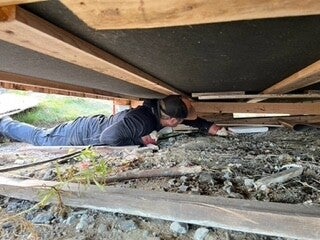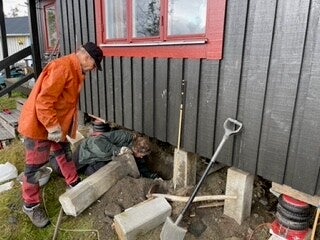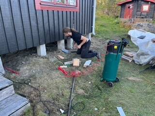 Vi hade sex luftkuddar som drivs med tryckluft från en kompressor det gick förvånansvärt bra att lyfta stugan med dessa. De flesta plintarna på norra och västra sidan som sjunkit ner i jorden alltför mycket grävde vi upp och justerade dem på rätt höjd. Även bärlinan för golvbjälkarna mitt under stugan justerades och fick ett antal extrastöd.