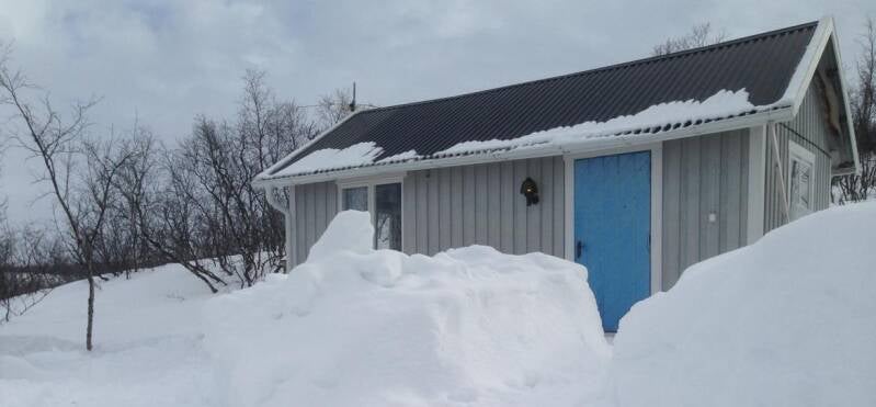 Gäststugan med två våningssängar, inredd med plats för avhängning, matbord och 2 stolar, radio, byrå och vacker utsikt över dass och Torneträsk.